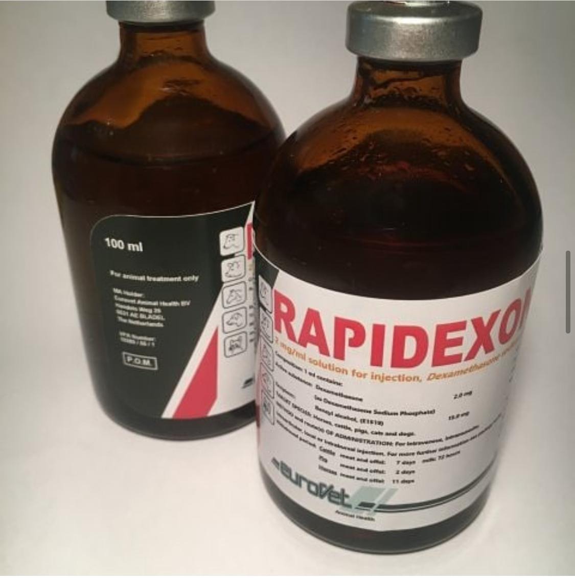 • Corticosteroids are known to have a wide variety of side effects. Although elevated single doses are usually well tolerated, prolonged administration may lead to severe adverse reactions, which may also occur with long-acting esters. Therefore, doses for medium to long-term treatments should generally be reduced to the minimum necessary to control clinical signs.• Corticosteroids may cause iatrogenic hyperadrenocorticism (Cushing’s syndrome) during treatment, which causes a significant alteration in the metabolism of fats, carbohydrates, proteins and minerals; For example, redistribution of body fat, weight gain, weakness and loss of muscle mass and osteoporosis can occur. During treatment, effective doses suppress the hypothalamic-pituitary-adrenal axis. After treatment discontinuation, signs of adrenal insufficiency can occur which can lead to adrenal cortical atrophy and this may render the animal unable to cope properly with stressful situations. Therefore, care should be taken to minimize the problems of adrenal insufficiency after treatment withdrawal (for more information, see standard texts). RAPIDEXON – 100ML